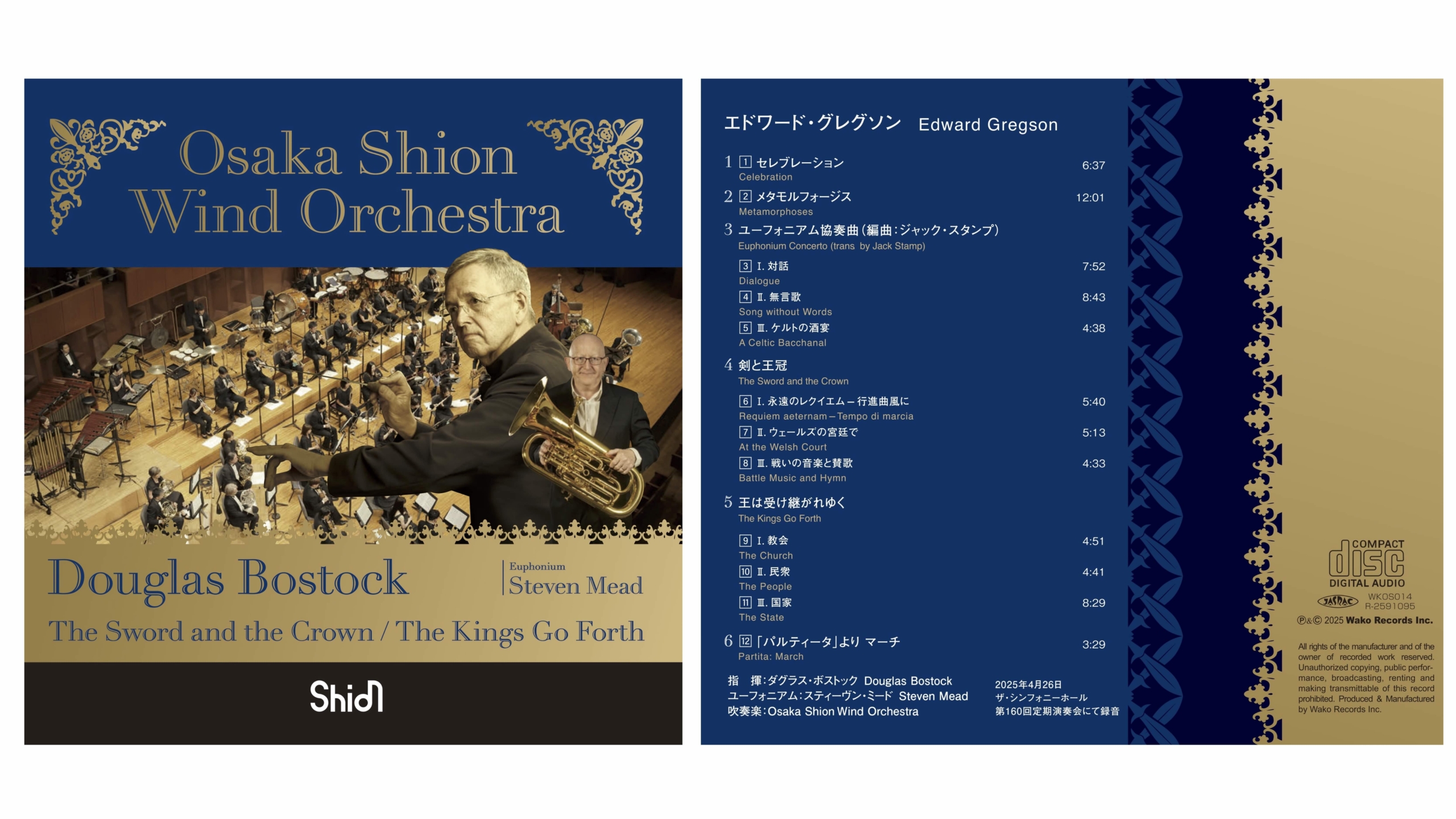 エドワード・グレグソン 1. 1) セレブレーション 2. 2) メタモルフォージス 3. ユーフォニアム協奏曲(編曲:ジャック・スタンプ) ユーフォニアム独奏:スティーヴン・ミード 3) Ⅰ.対話 4) Ⅱ.無言歌 5) Ⅲ.ケルトの酒宴 4. 剣と王冠 6) Ⅰ.永遠のレクイエム – 行進曲風に 7) Ⅱ.ウェールズの宮廷で 8) Ⅲ.戦いの音楽と賛歌 5. 王は受け継がれゆく 9) Ⅰ.教会 10) Ⅱ.民衆 11) Ⅲ.国家 6. 「パルティータ」より マーチ |