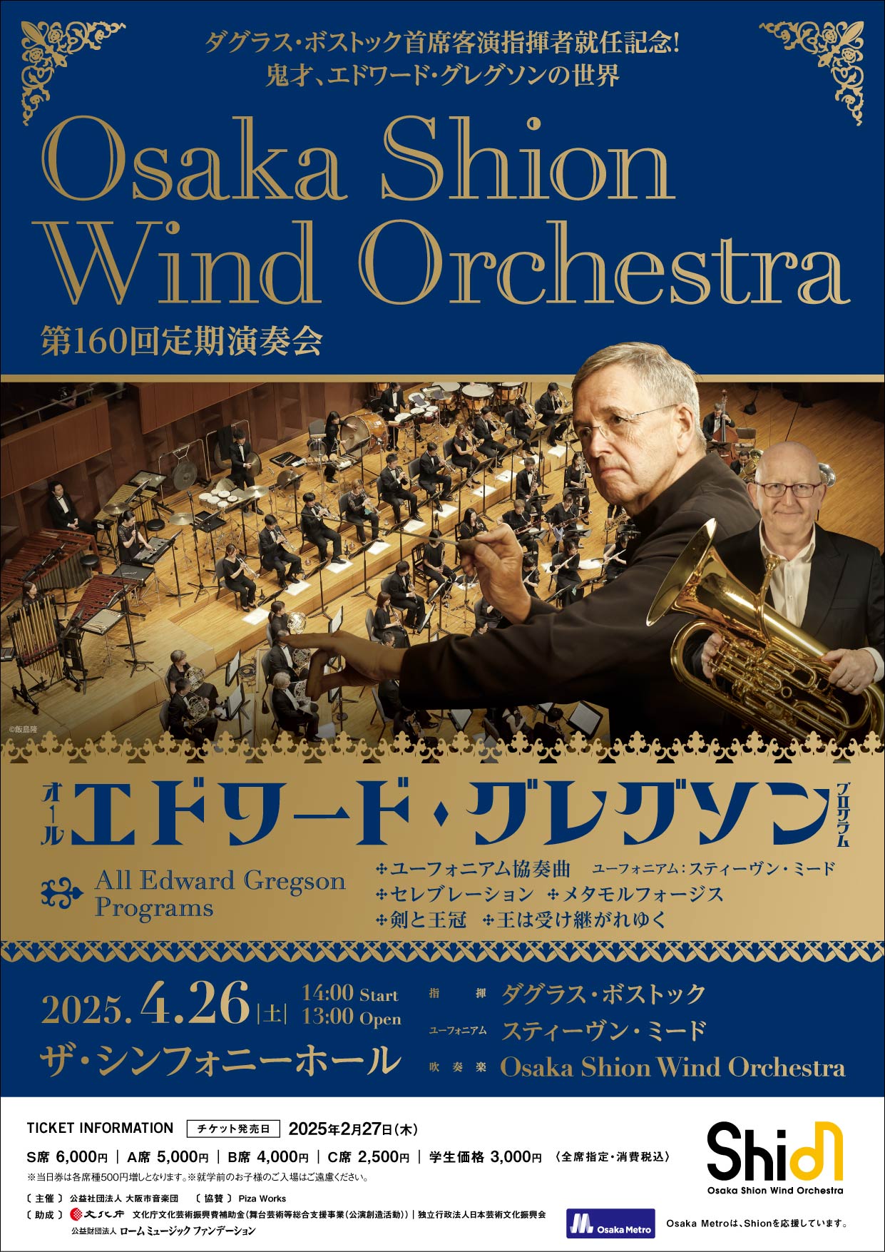 | 公演概要 | 日時:2025年4月26日(土) 13:00開場/14:00開演 指揮:ダグラス・ボストック(首席客演指揮者) ユーフォニアム:スティーヴン・ミード 吹奏楽:Osaka Shion Wind Orchestra 会場:ザ・シンフォニーホール(大阪市北区大淀南二丁目3-3) |