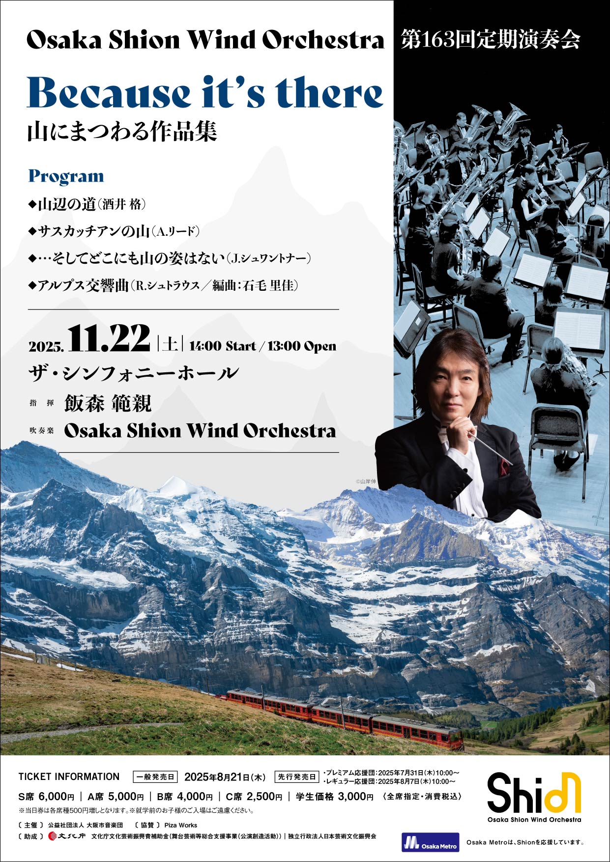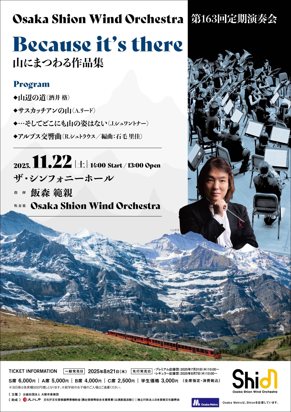 | 公演概要 | 日時:2025年11月22日(土) 13:00開場/14:00開演 指揮:飯森 範親 吹奏楽:Osaka Shion Wind Orchestra 会場:ザ・シンフォニーホール(大阪市北区大淀南二丁目3-3) |