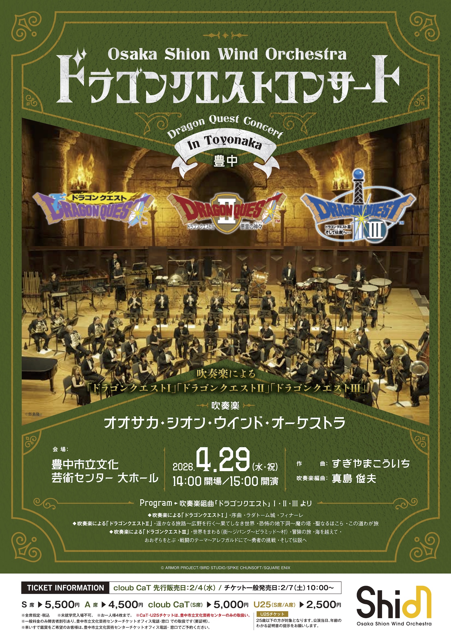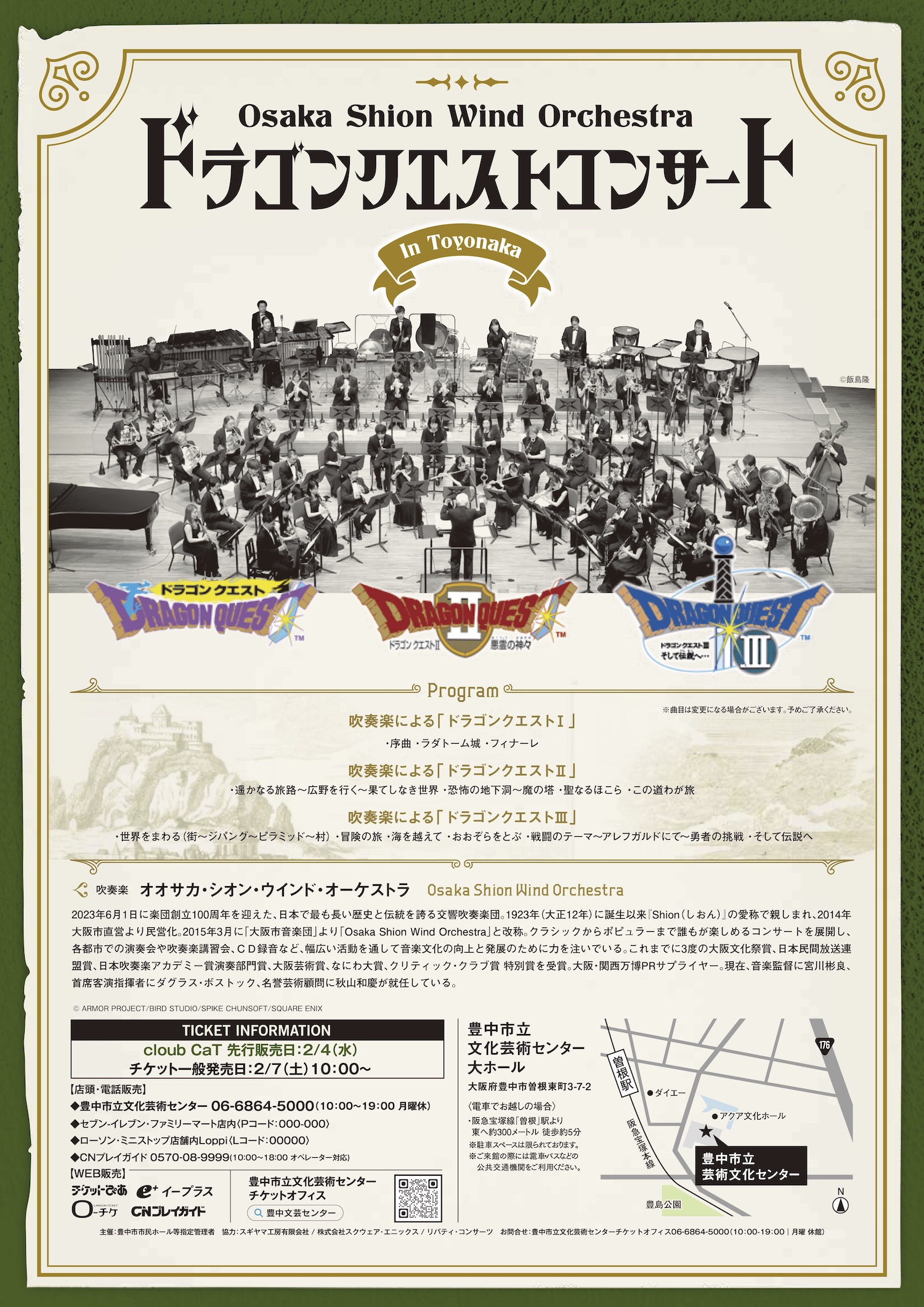 吹奏楽による「ドラゴンクエストⅠ」 吹奏楽による「ドラゴンクエストⅡ」 吹奏楽による「ドラゴンクエストⅢ」 ※やむを得ぬ事情により、出演者、曲目等が変更になる場合があります。予めご了承ください。 |