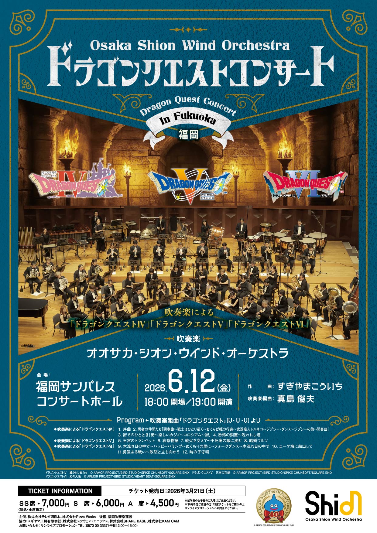 吹奏楽による「ドラゴンクエストIV」 吹奏楽による「ドラゴンクエストV」 吹奏楽による「ドラゴンクエストVI」 ※やむを得ぬ事情により、出演者、曲目等が変更になる場合があります。予めご了承ください。 |