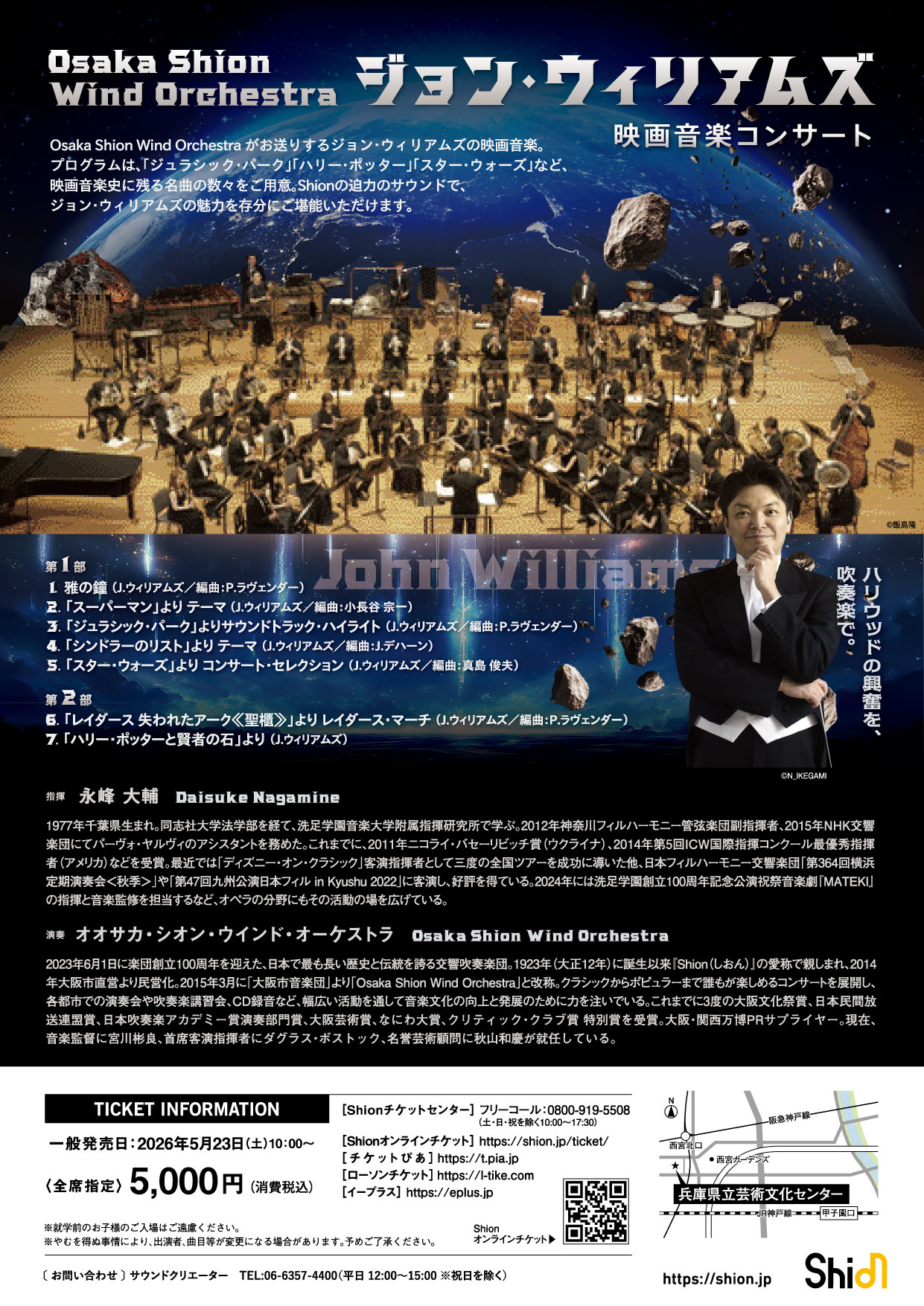 | 公演概要 | 日時:2026年6月20日(土) 14:00開場/15:00開演 指揮:永峰 大輔 演奏:Osaka Shion Wind Orchestra 会場:兵庫県立芸術文化センター KOBELCO大ホール(兵庫県西宮市高松町2-22) |
