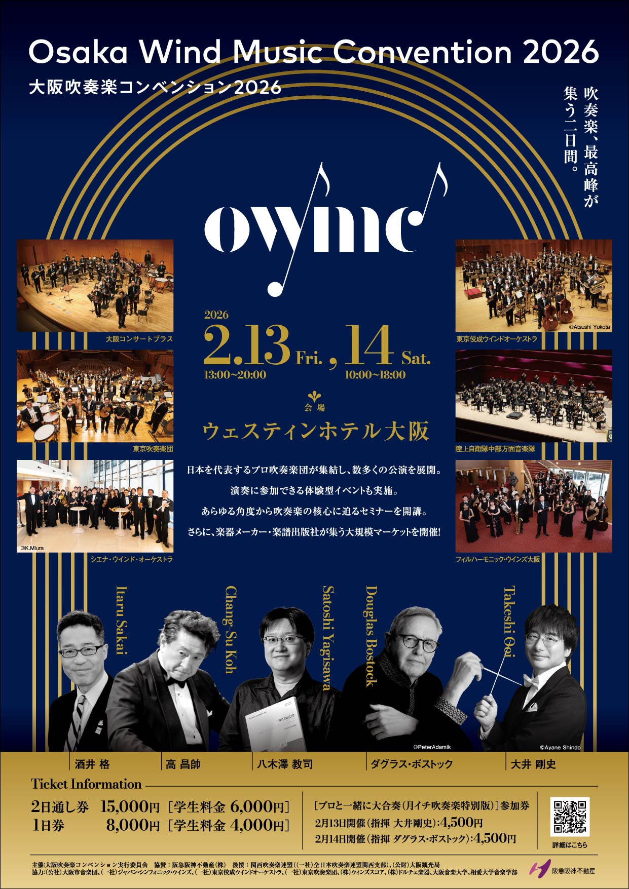 | 主催・後援 | 主催:大阪吹奏楽コンベンション実行委員会 協賛:阪急阪神不動産(株) 後援:関西吹奏楽連盟((一社)全日本吹奏楽連盟関西支部)、(公財)大阪観光局 協力:(公社)大阪市音楽団、(一社)ジャパン・シンフォニック・ウインズ、(一社)東京佼成ウインドオーケストラ、 (一社)東京吹奏楽団、(株)ウィンズスコア、(株)ドルチェ楽器、大阪音楽大学、相愛大学音楽学部 |