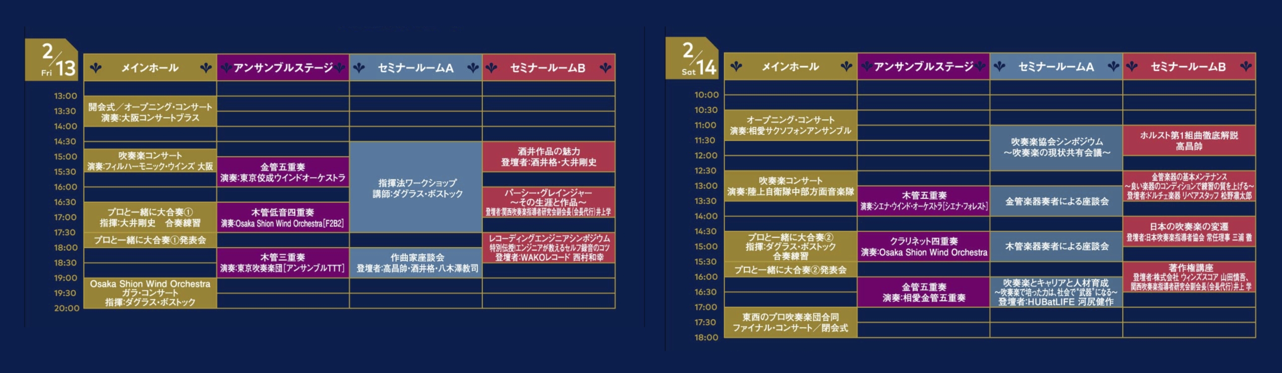 | 主な出演者 | [演 奏]Osaka Shion Wind Orchestra 東京佼成ウインドオーケストラ シエナ・ウインド・オーケストラ 東京吹奏楽団 フィルハーモニック・ウインズ 大阪 陸上⾃衛隊中部⽅⾯⾳楽隊 大阪コンサートブラス ほか [指 揮]ダグラス・ボストック(Osaka Shion Wind Orchestra首席客演指揮者) 大井 剛史(東京佼成ウインドオーケストラ常任指揮者) [作曲家]高 昌帥、酒井 格、朴 守賢、八木澤 教司 |