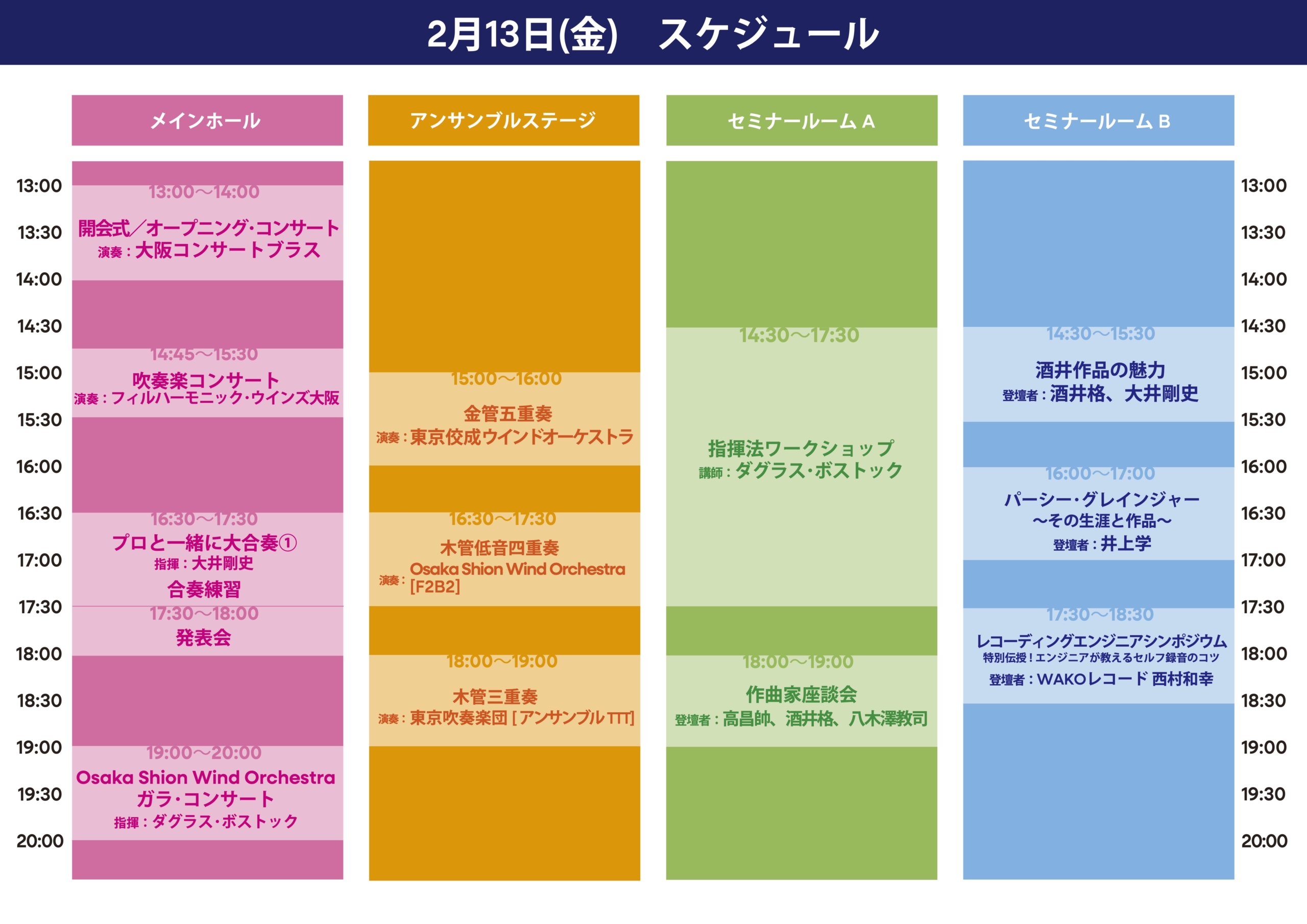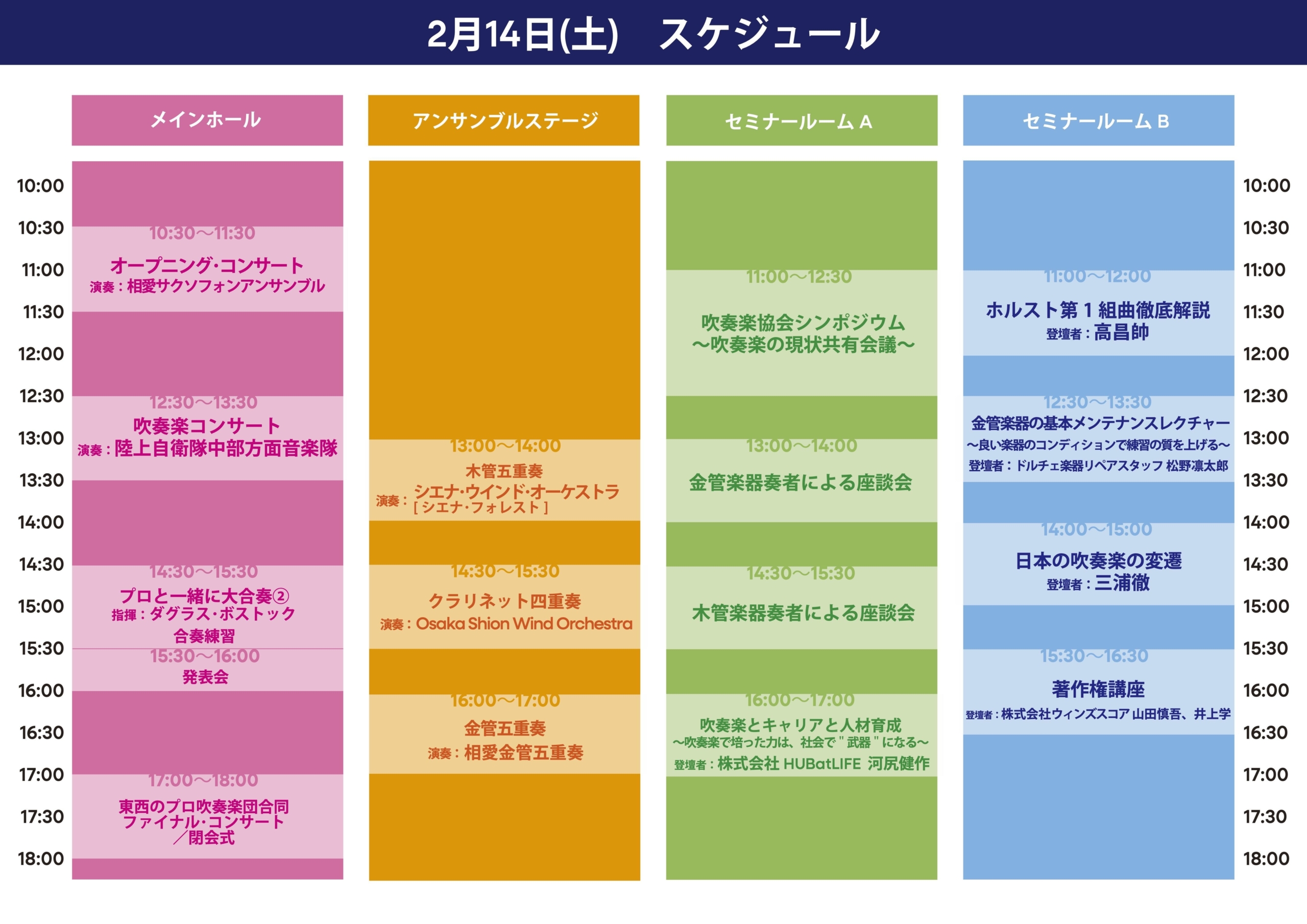 | 主な出演者 | [演 奏]Osaka Shion Wind Orchestra 東京佼成ウインドオーケストラ シエナ・ウインド・オーケストラ 東京吹奏楽団 フィルハーモニック・ウインズ 大阪 陸上⾃衛隊中部⽅⾯⾳楽隊 大阪コンサートブラス ほか [指 揮]ダグラス・ボストック(Osaka Shion Wind Orchestra首席客演指揮者) 大井 剛史(東京佼成ウインドオーケストラ常任指揮者) [作曲家]高 昌帥、酒井 格、八木澤 教司 |