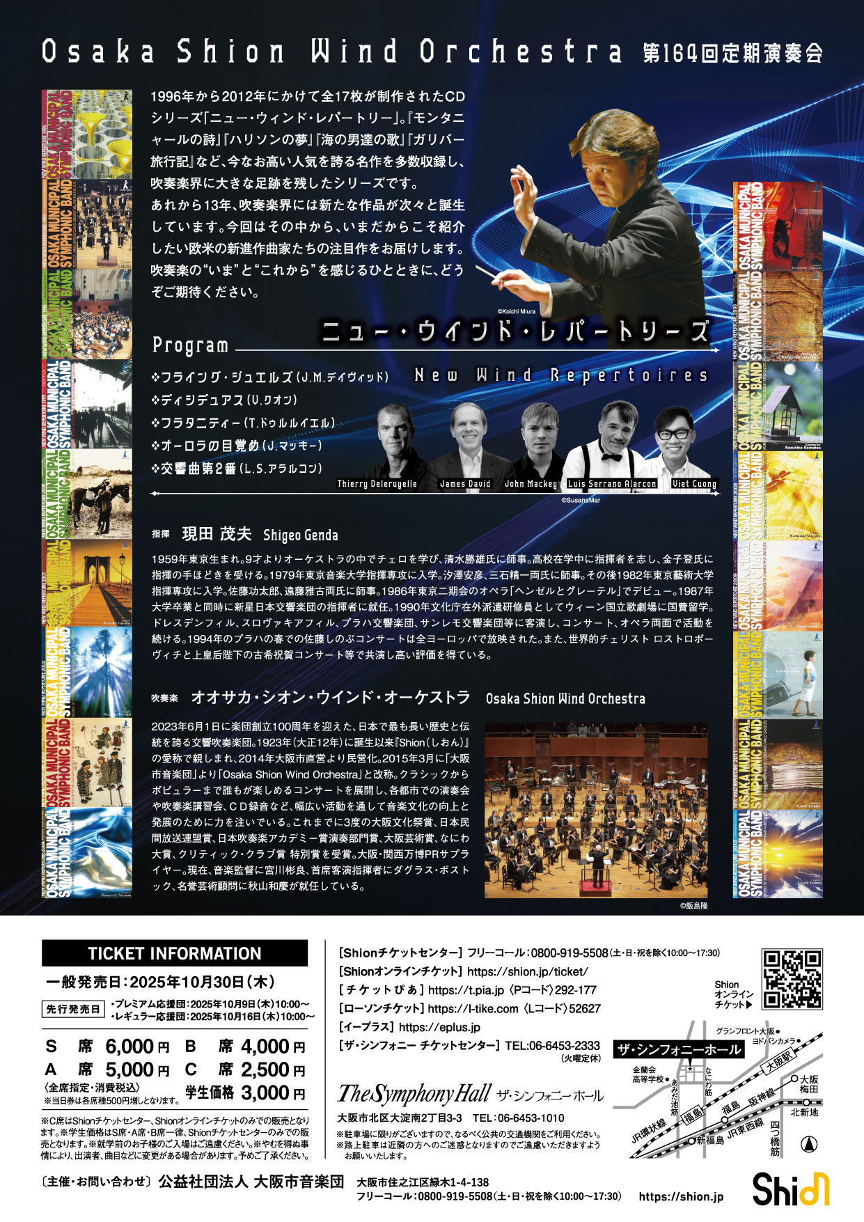 | Performance Overview | Date: January 31, 2026 Saturday 13:00 Open / 14:00 Start Conductor: Shigeo Genda Wind Orchestra: Osaka Shion Wind Orchestra Venue: The Symphony Hall (2-3-3 Oyodo Minami, Kita Ward, Osaka City) |