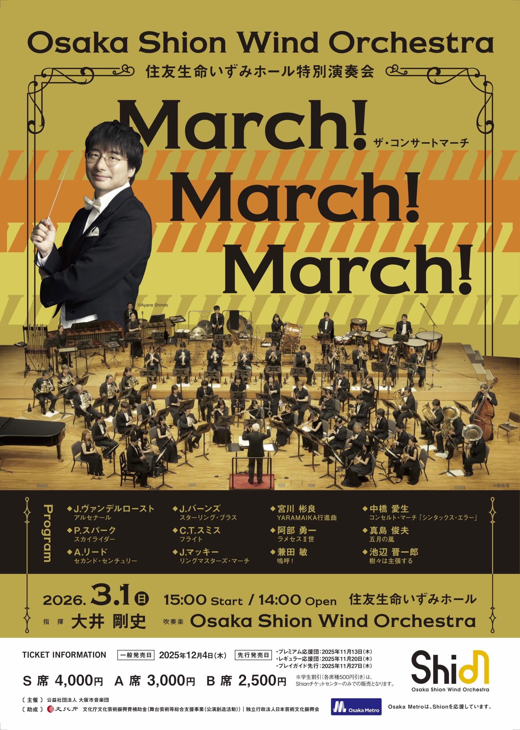 | Performance Overview | Date: March 1, 2026 Sunday 14:00 Open / 15:00 Start Conductor: Takeshi Ooi Wind Orchestra: Osaka Shion Wind Orchestra Venue: Sumitomolife Izumi Hall (1-4-70 Shiromi, Chuo Ward, Osaka City) |